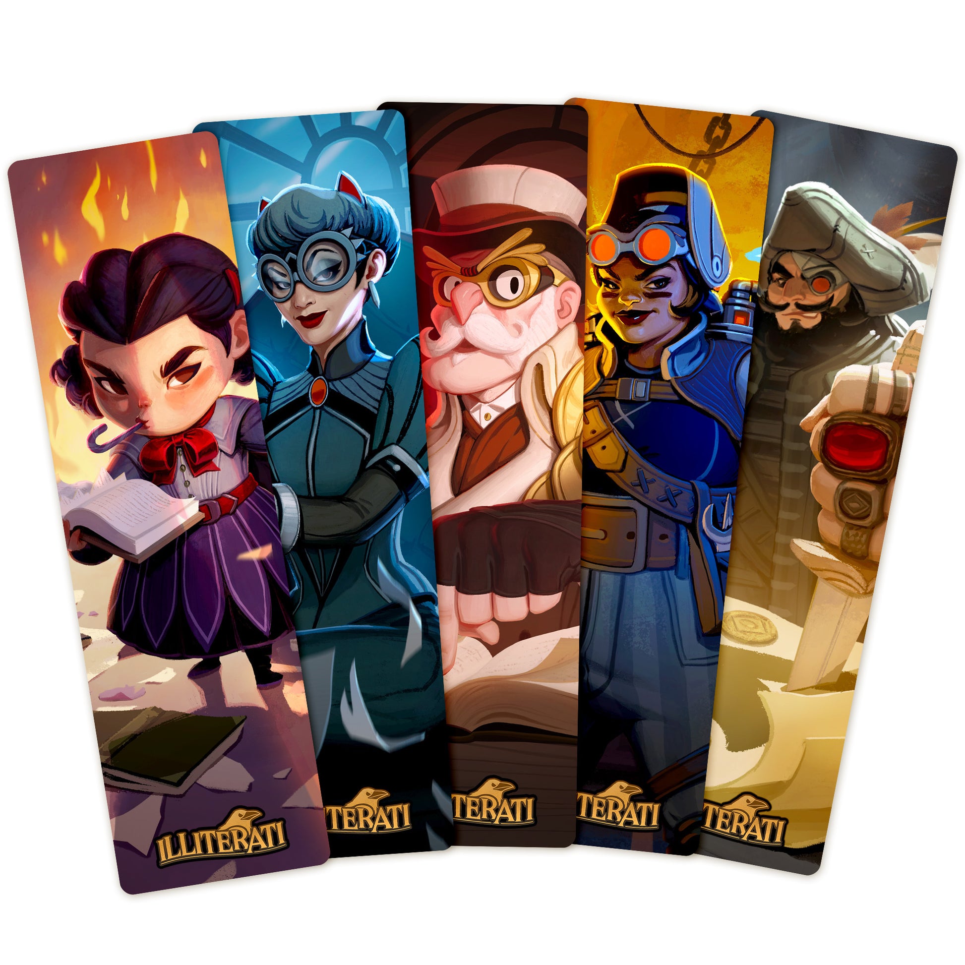 A pack of 5 stunning bookmarks featuring the art of each Illiterati Villain - the (im)perfect companions for your books.