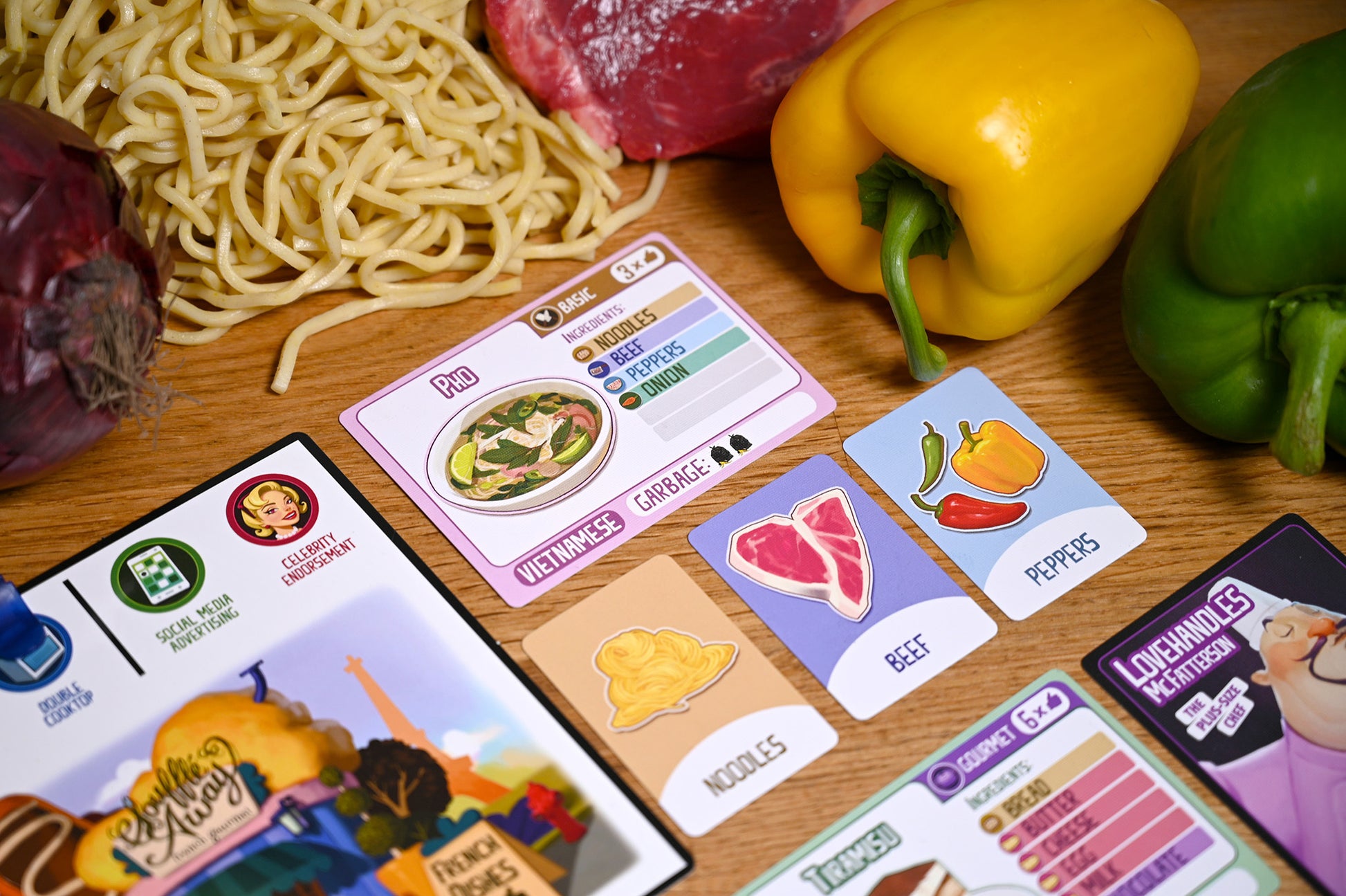 Rival Restaurants is an asymmetrical, real time, strategy and negotiating game for 2-6 players where revenge is a dish best served cold . . . and hot.  Each player will play one of 8 different restaurants, each with different level up bonuses, and combine them with one of 12 different chefs, each with a different chef powers. Each player starts with two recipes and work to acquire the required ingredients so that they can score popularity points by cooking recipes. The first player to earn 20 popularity points is declared “The Wiener” and wins the game.